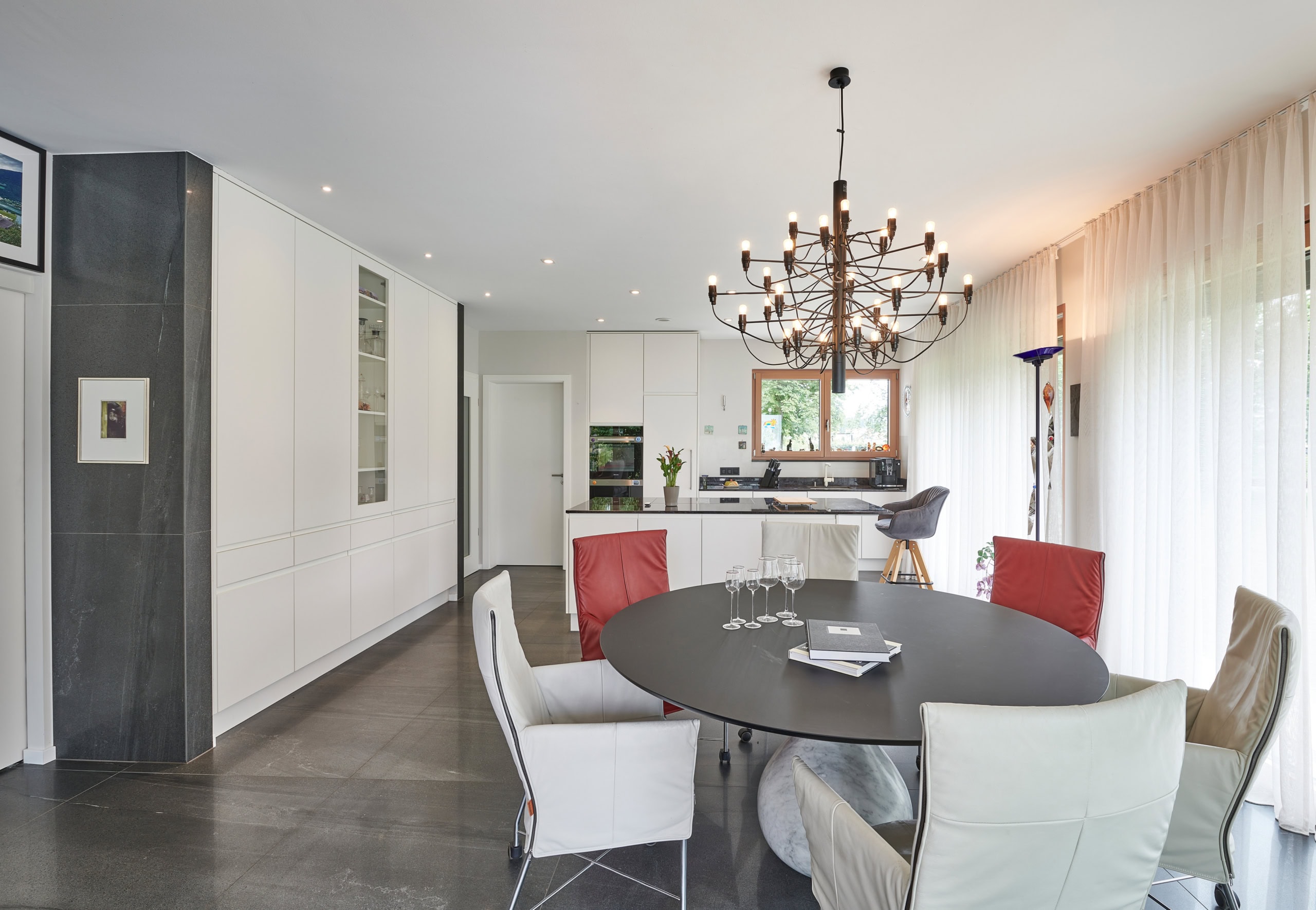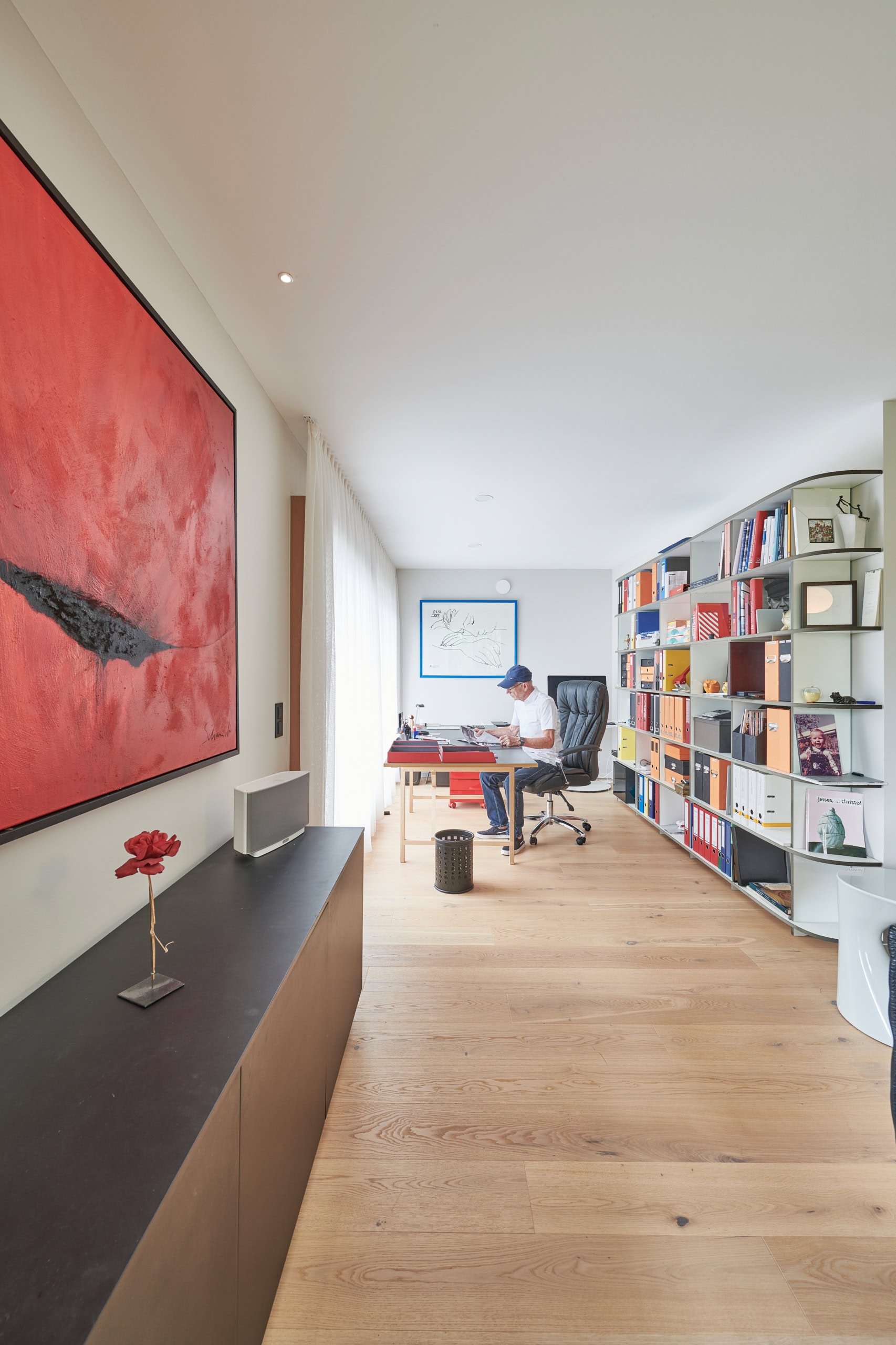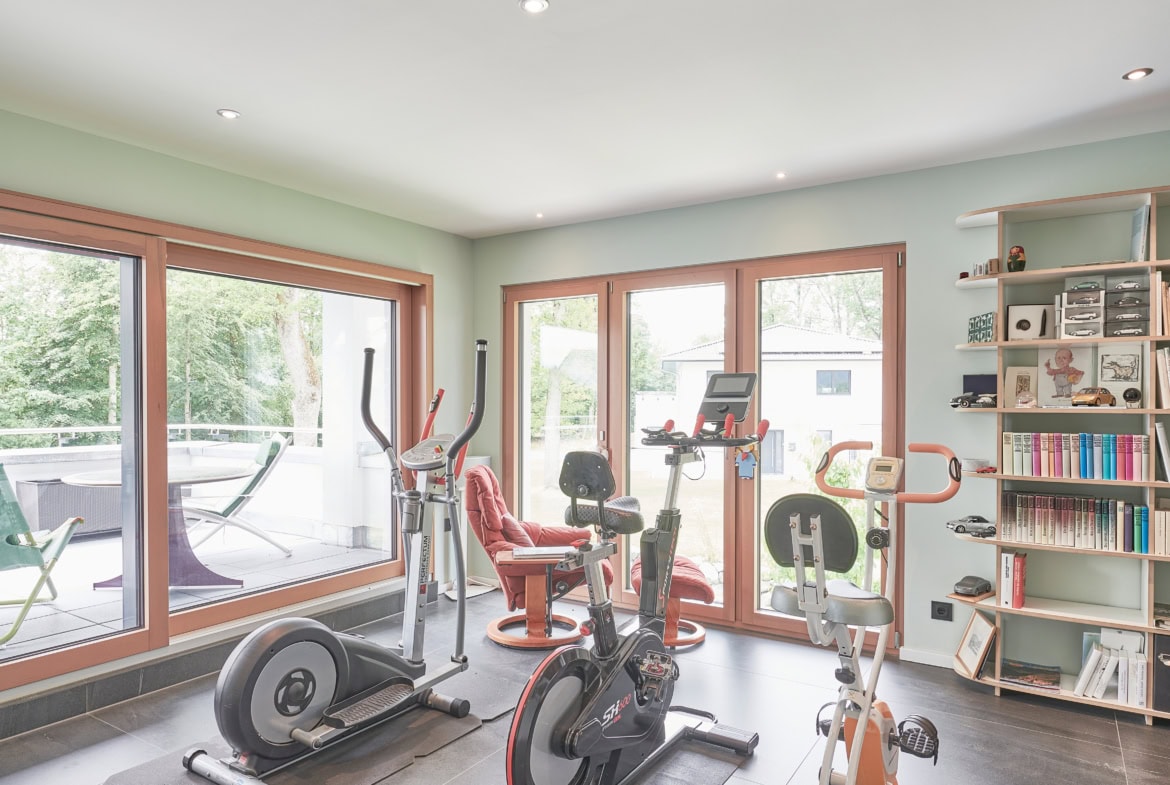 Bei der Planung stand die barrierefreie Nutzung des Erdgeschosses im Vordergrund. Es vereint Wohn- und Schlafbereich, Küche und Bad auf einer Ebene. Im Obergeschoss befindet sich ein großes Homeoffice mit Gartenblick, ein Wellnessbereich mit Sauna und eine kleine Einliegerwohnung, die aktuell für Gäste genutzt wird und langfristig Pflegepersonal aufnehmen soll. Herzstück des Hauses ist ein großflächig verglaster Erker im Erdgeschoss, der sich oben zu einer Loggia weitet und zugleich die darunterliegende Terrasse überdacht.