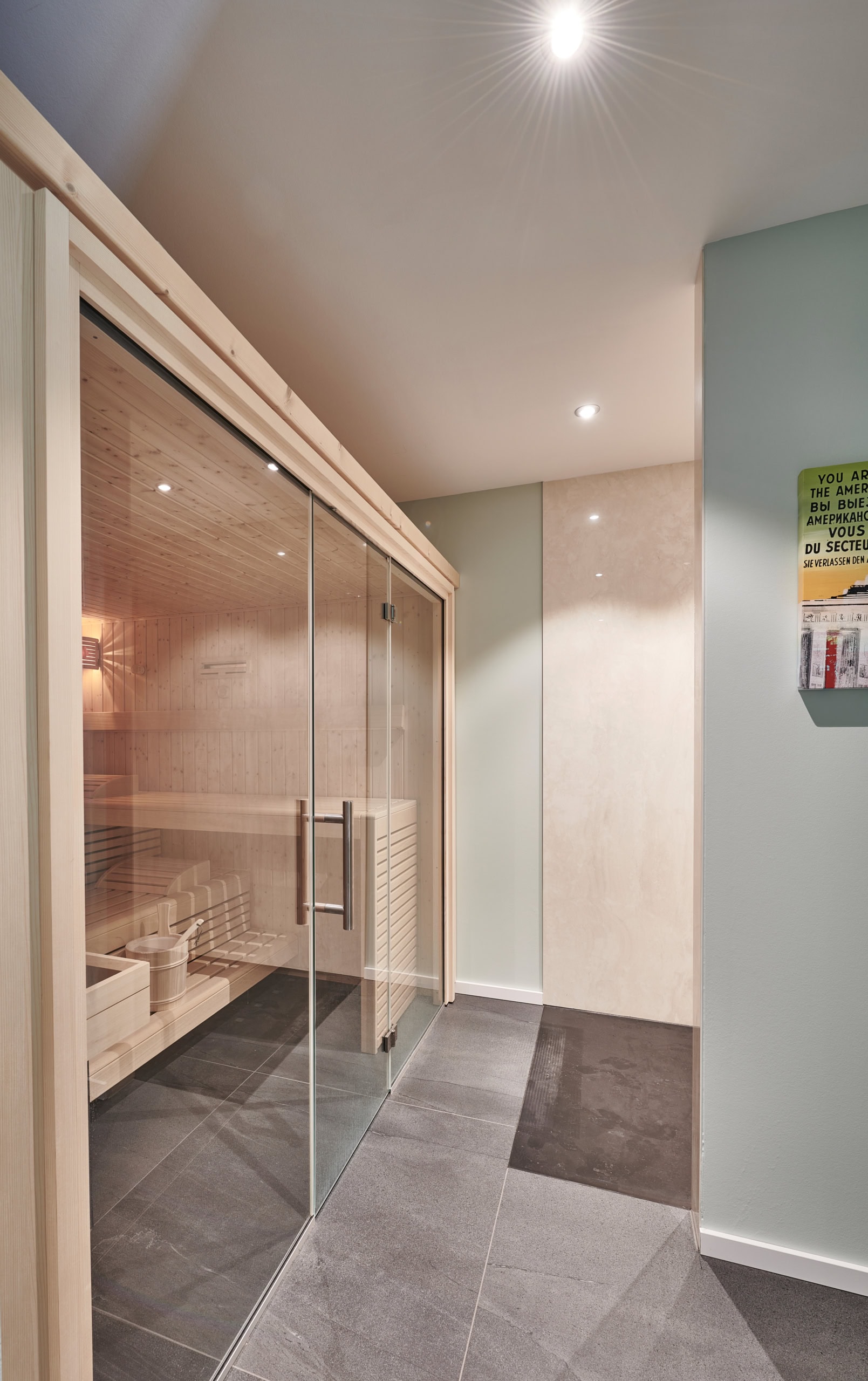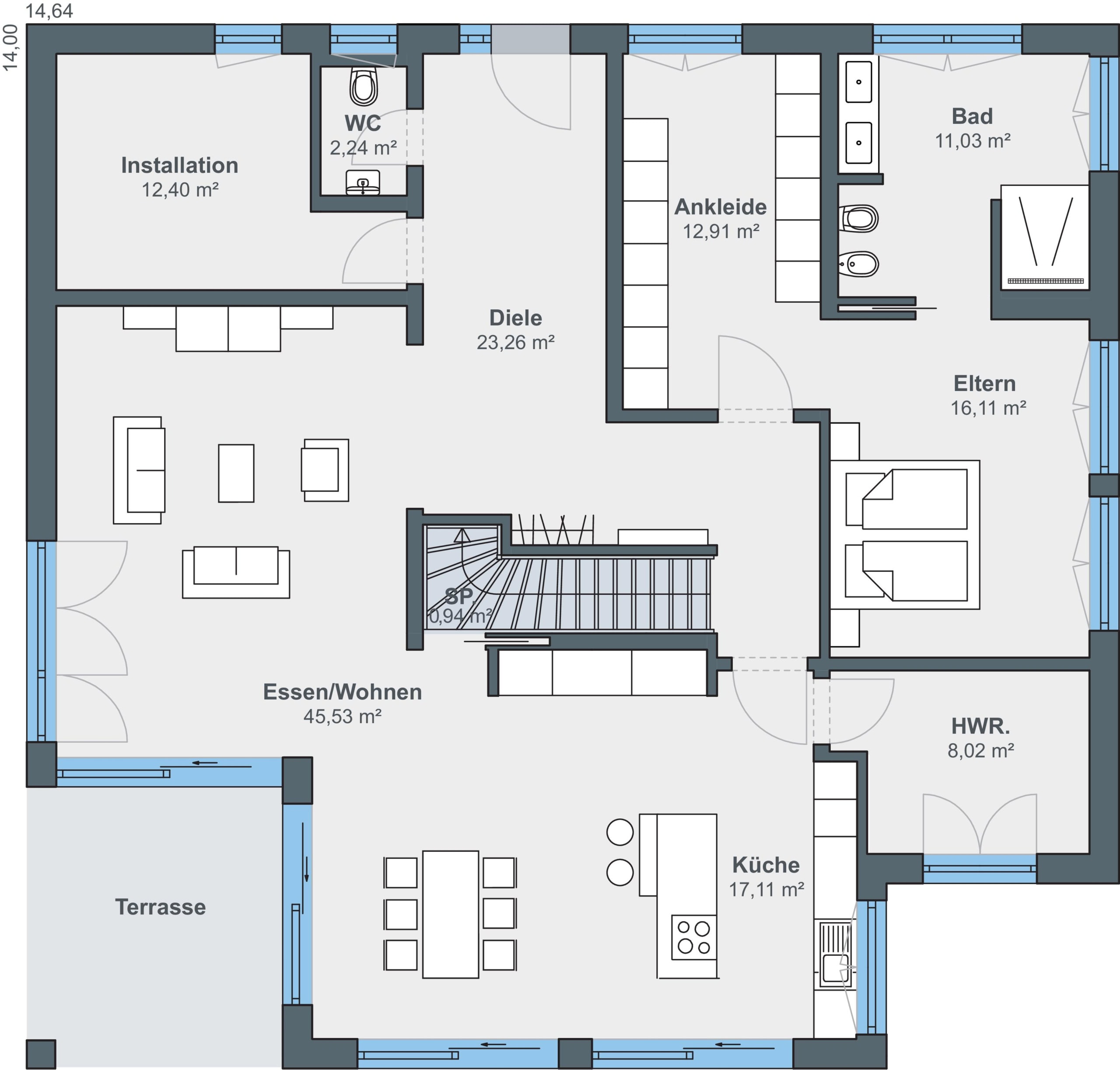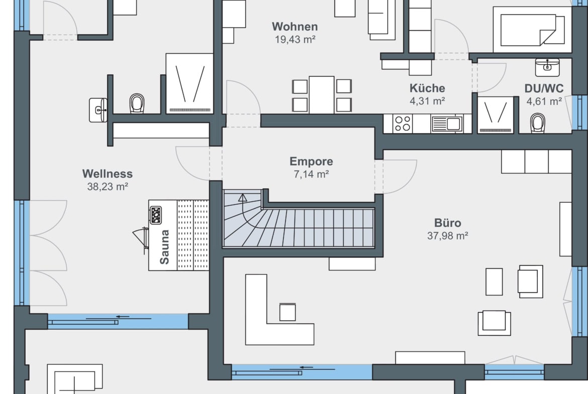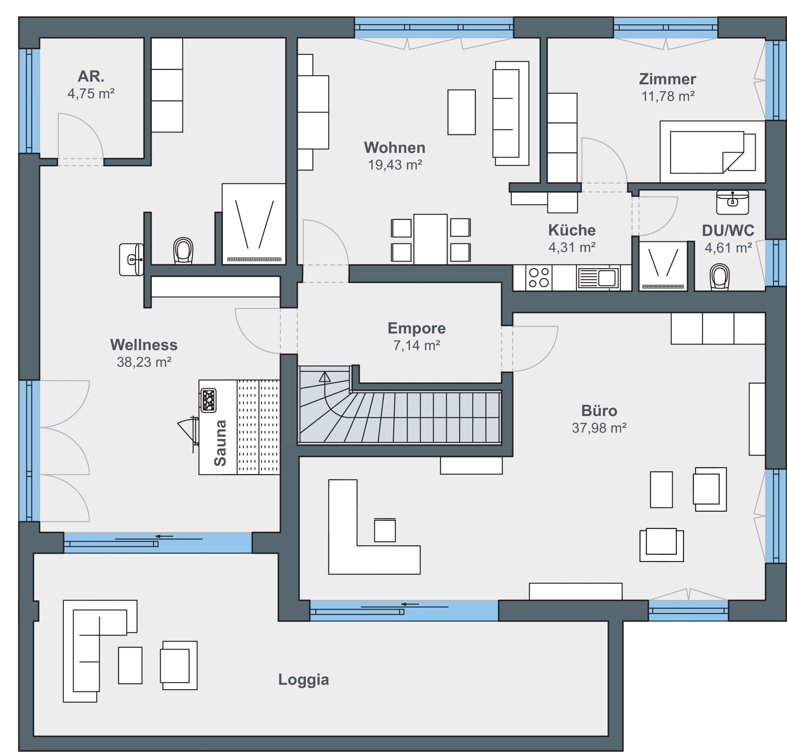 Bei der Planung stand die barrierefreie Nutzung des Erdgeschosses im Vordergrund. Es vereint Wohn- und Schlafbereich, Küche und Bad auf einer Ebene. Im Obergeschoss befindet sich ein großes Homeoffice mit Gartenblick, ein Wellnessbereich mit Sauna und eine kleine Einliegerwohnung, die aktuell für Gäste genutzt wird und langfristig Pflegepersonal aufnehmen soll. Herzstück des Hauses ist ein großflächig verglaster Erker im Erdgeschoss, der sich oben zu einer Loggia weitet und zugleich die darunterliegende Terrasse überdacht.