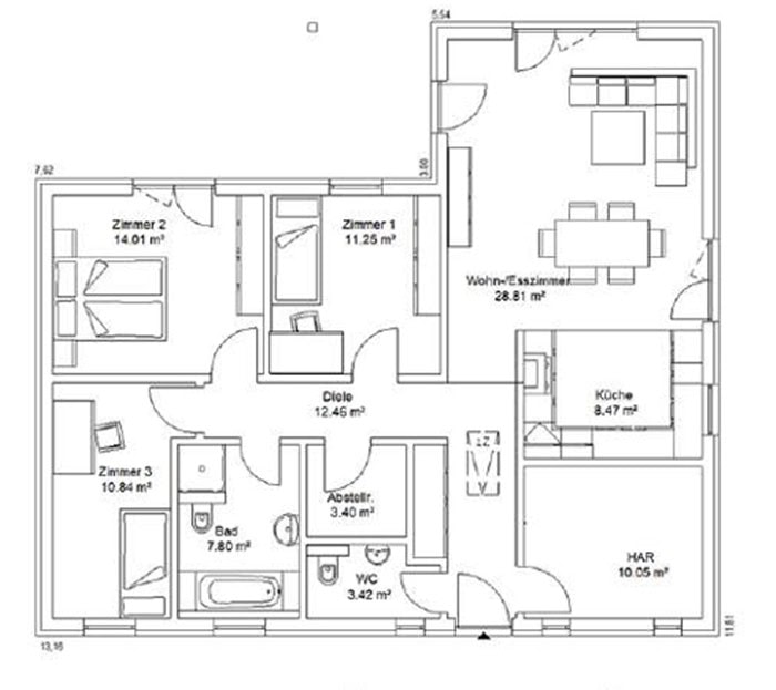 Ideenreich und treppenfrei - Dieser Enovia-Winkelbungalow mit Walmdach bietet Ihnen komfortables Wohnen auf einer Ebene. Auf Wunsch kann er auch komplett barrierefrei ausgeführt werden. Der Grundriss überrascht durch funktionale Details wie eine an die Küche angeschlossene Speisekammer und einen Hauswirtschaftsraum. So können Sie durch die geschickte Planung viel Wohnqualität erleben – ganz ohne Treppensteigen.