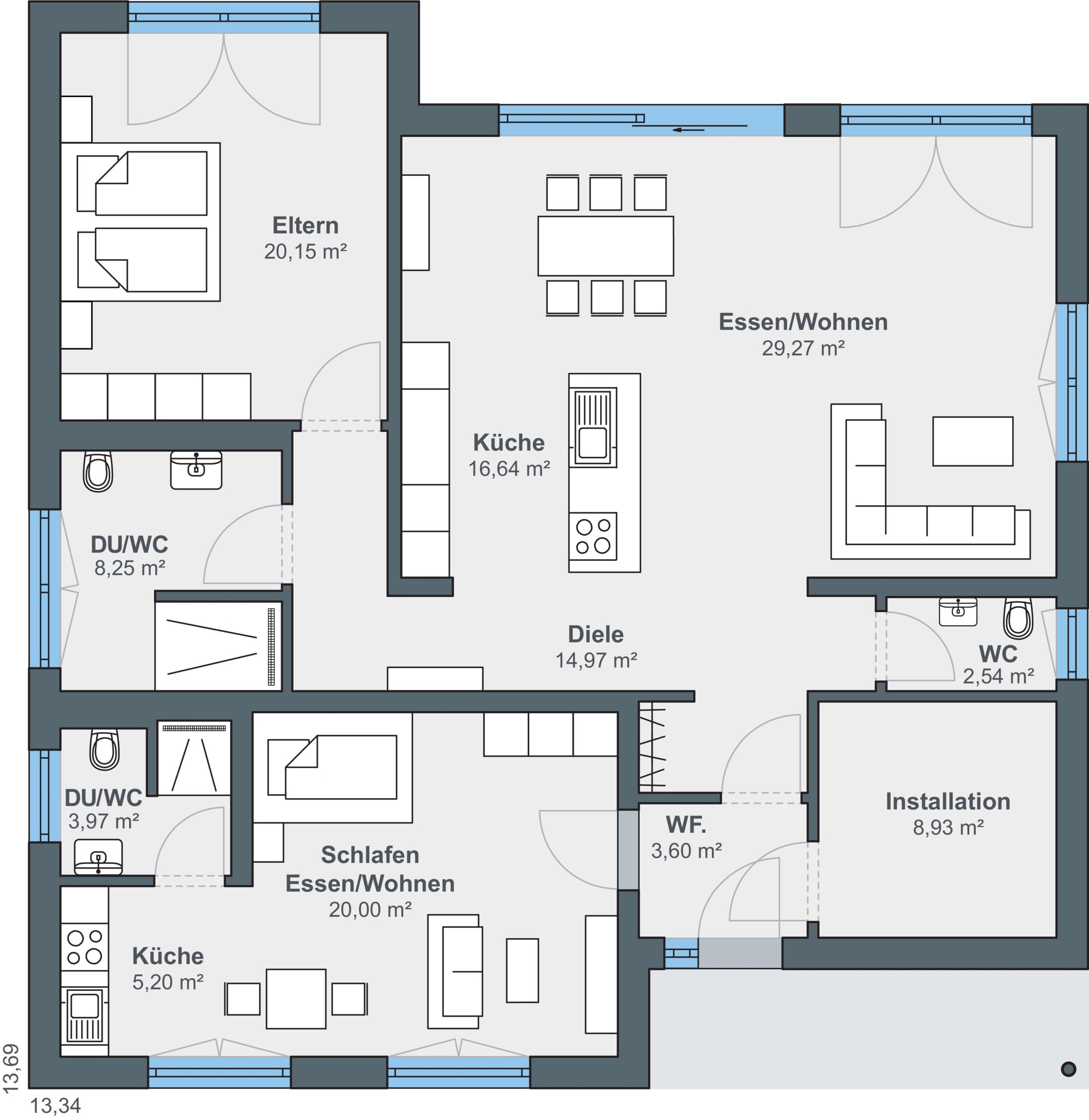 Der Grundriss ist übersichtlich geplant und in eine Hauptwohnung sowie in eine kleine Einliegerwohnung unterteilt. Diese kleine Wohnung ist rund 30 Quadratmeter groß, hat ein eigenes Bad mit Dusche und Anschlüsse für eine Küche. Sie kann als Gäste-, Arbeits- oder Jugendzimmer genutzt werden oder später als separate Wohneinheit dienen.