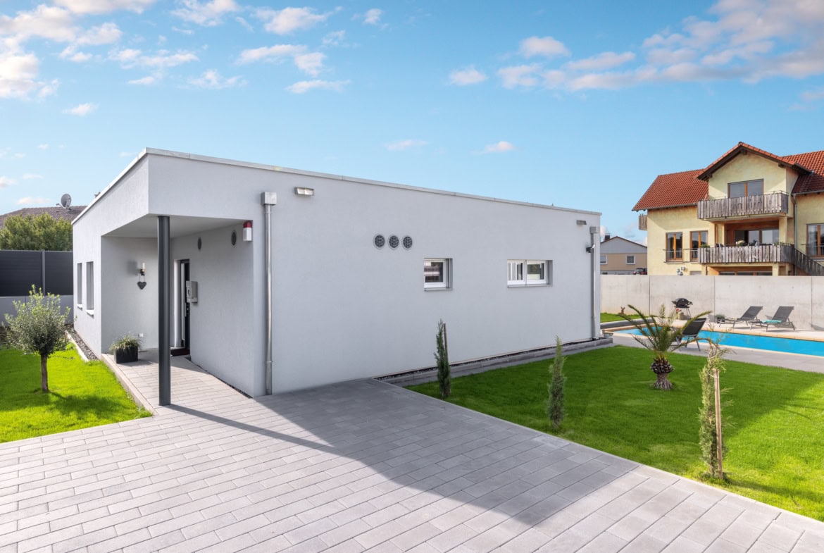 Das Haus myLife 402 ist ein moderner Bungalow vom Fertighaus Anbieter WeberHaus. Es handelt sich um ein Einfamilienhaus, bei dem alle Räume auf einer Ebene liegen. Dadurch ist das Haus besonders bequem und barrierearm nutzbar, zum Beispiel für Familien oder für das Wohnen im Alter. Die Wohnfläche beträgt etwa 133 Quadratmeter. Das moderne Flachdach verleiht dem Bungalow ein schlichtes und zeitgemäßes Aussehen und bietet Platz für eine Photovoltaikanlage.