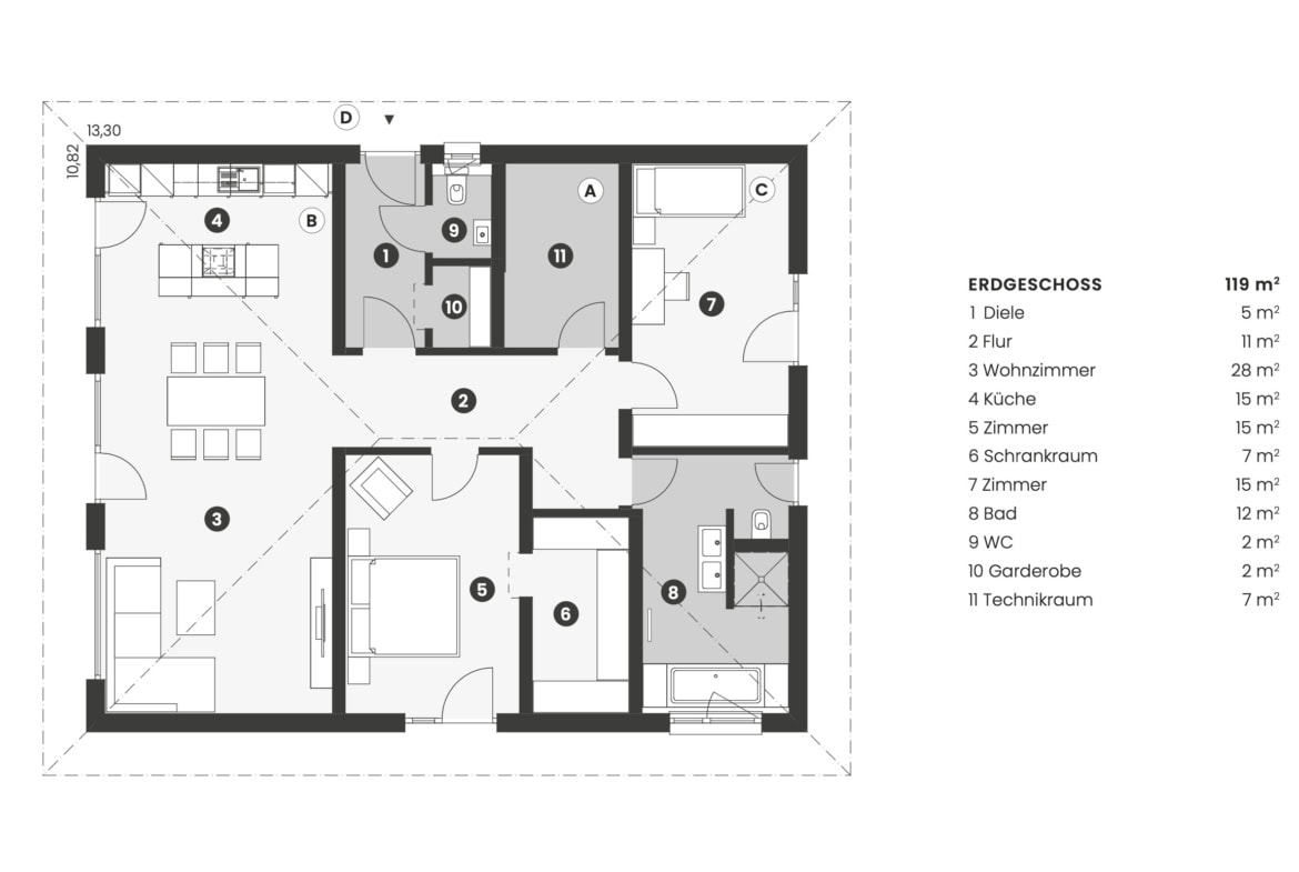 Der moderne Fertighaus Bungalow Now 118 von ELK Haus ist mit einer Wohnfläche von 118 m² ideal für Paare und kleine Familien geeignet und lässt sich problemlos an wechselnde Lebenssituationen anpassen. Der eingeschossige Bungalow Grundriss verfügt über einen großzügigen Wohn- und Essbereich mit offener Küche samt Kochinsel, der als lichtdurchfluteter, kommunikativer Mittelpunkt des Hauses dient. Ergänzt wird das Raumkonzept durch private Rückzugsorte, zu denen ein Schlafzimmer mit Ankleide und ein zweites Zimmer zählt, sodass insgesamt drei Zimmer zur Verfügung stehen. Die äußere Erscheinung wird von einem klassischen Walmdach und einer modernen Holz Putz Fassade geprägt, die dem Bungalow eine zeitlose elegante Ausstrahlung verleihen. Das ELK Haus ist bewusst barrierefreundlich konzipierbar und lässt sich auch rollstuhlgerecht umsetzen, wodurch Komfort und Zugänglichkeit über alle Lebensphasen gewährleistet sind. Für individuelle Bedürfnisse sind weitere Grundrissvarianten und Dachformen z.B. mit Flachdach verfügbar, sodass sich der Fertighaus Bungalow Now 118 sowohl in Stil als auch in Funktionalität an persönliche Wünsche anpassen lässt.