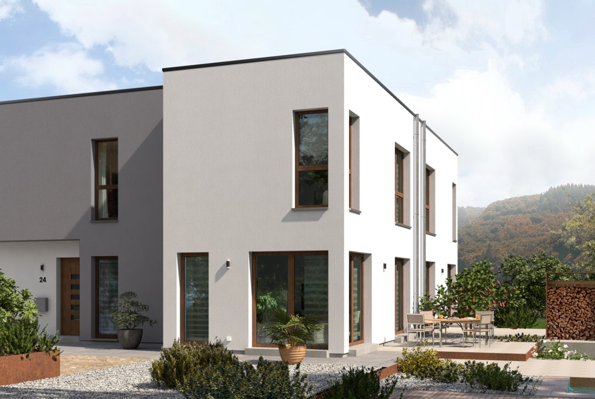 Zwei volle Geschosse mit Flachdach – ein echtes Raumwunder und von außen schon ein Hingucker, so präsentiert sich unsere Doppelhaushälfte Double 8.