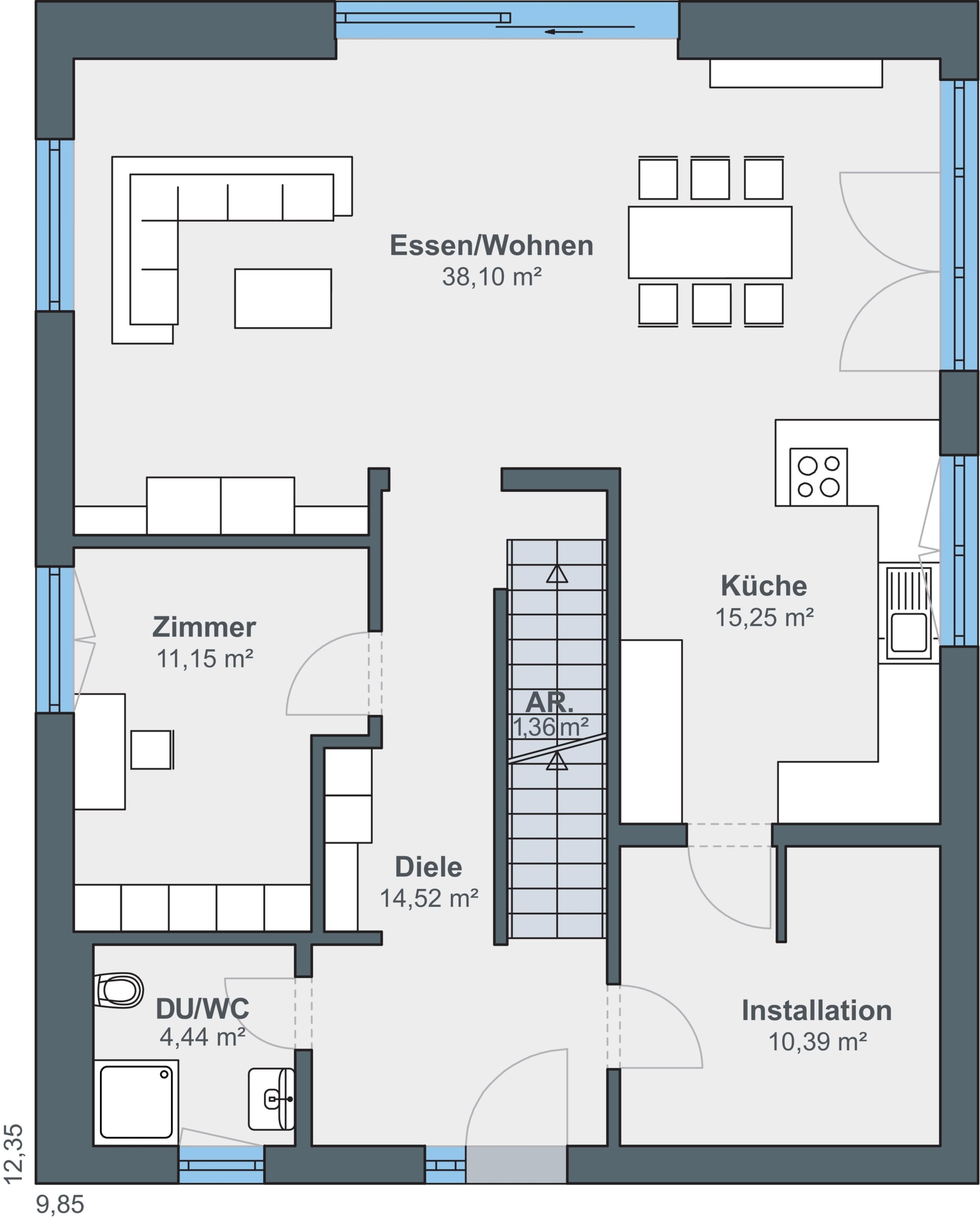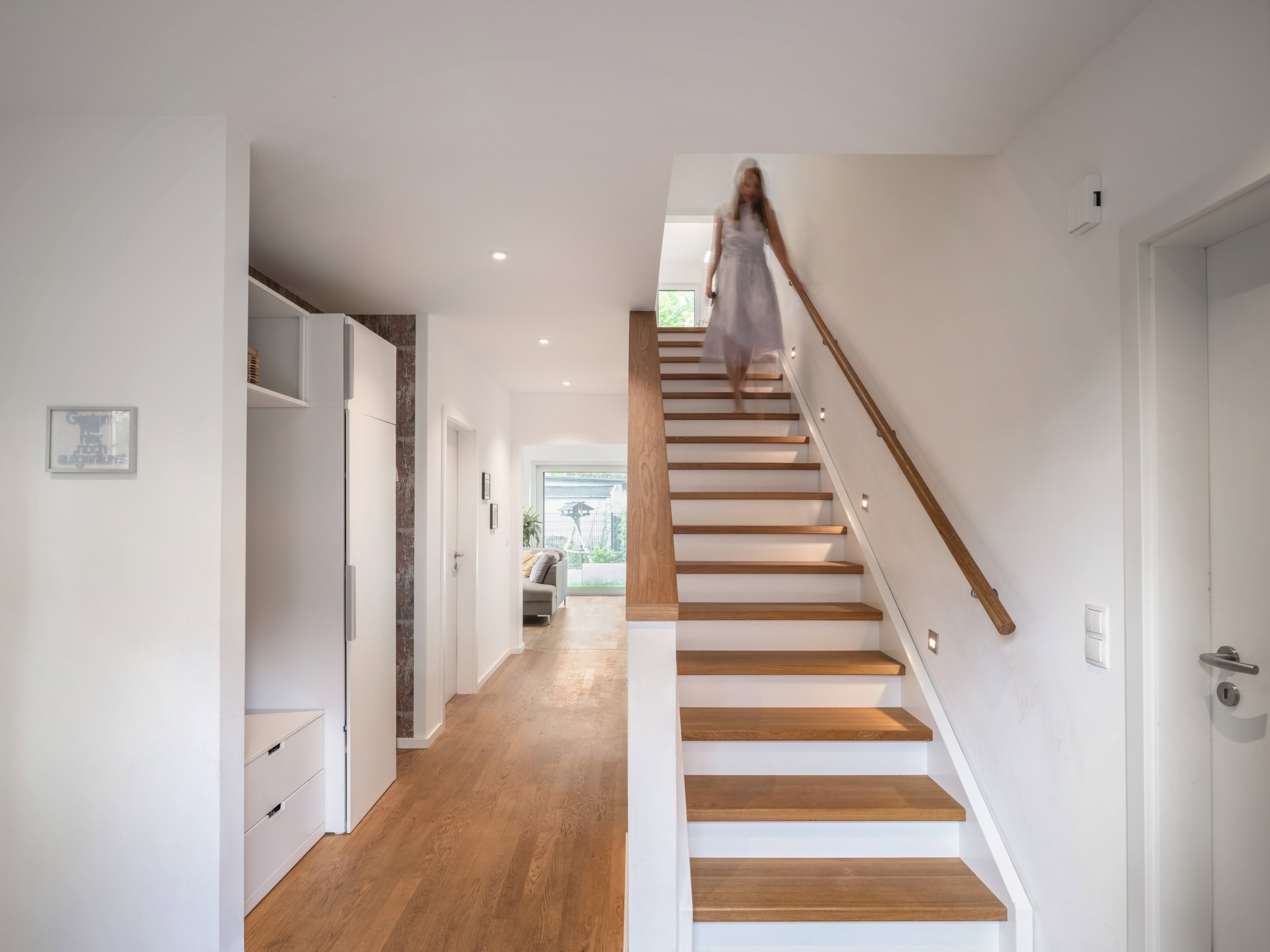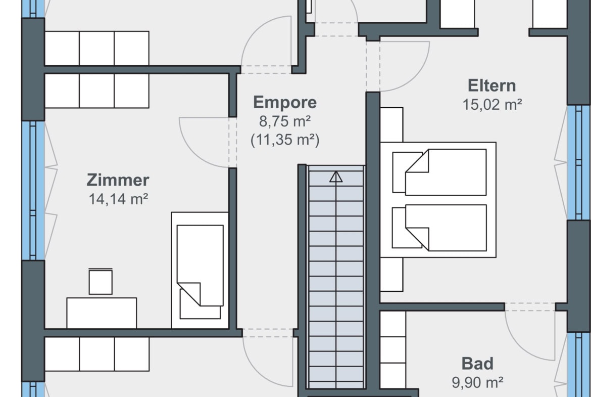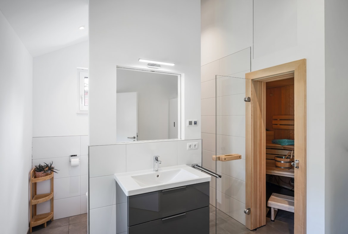 Dieses moderne Einfamilienhaus mit Satteldach ist für eine fünfköpfige Familie geplant. Das Fertighaus basiert auf der WeberHaus Baureihe generation5.5 und verfügt über rund 180 Quadratmeter Wohnfläche. Die Fassade ist schlicht und weiß verputzt. Graue Fensterrahmen und passende Dachziegel runden das Erscheinungsbild ab und lassen das Haus zeitlos und modern wirken. Die Gebäudehülle ÖvoNatur Therm besteht aus umwelt- und gesundheitsverträglichen Materialien und ist bei allen Häusern von WeberHaus Standard. Das sorgt für ein besseres Raumklima und gute Dämmwerte. Auf dem Dach ist eine Photovoltaik-Anlage montiert und ein Batteriespeicher ergänzt die Anlage. Insgesamt verfügt das Haus über sechs Zimmer. Im Erdgeschoss liegt ein großes Wohn‑Esszimmer mit offen gestalteter Küche und direktem Zugang zum Garten und Terrasse. Die Räume sind klar gegliedert und bieten flexible Nutzungsmöglichkeiten. Eine gerade Treppe führt ins Obergeschoss. Dort befinden sich drei Kinderzimmer und ein gemeinsames Bad. Außerdem gibt es einen großzügigen Elternbereich mit Schlafzimmer, Ankleide und einem großen Badezimmer mit Sauna. Die Aufteilung bietet viel Privatsphäre und Alltagskomfort. Das Haus verbindet klassische Ästhetik mit moderner Technik und richtet sich an Familien, die Energieeffizienz wünschen.