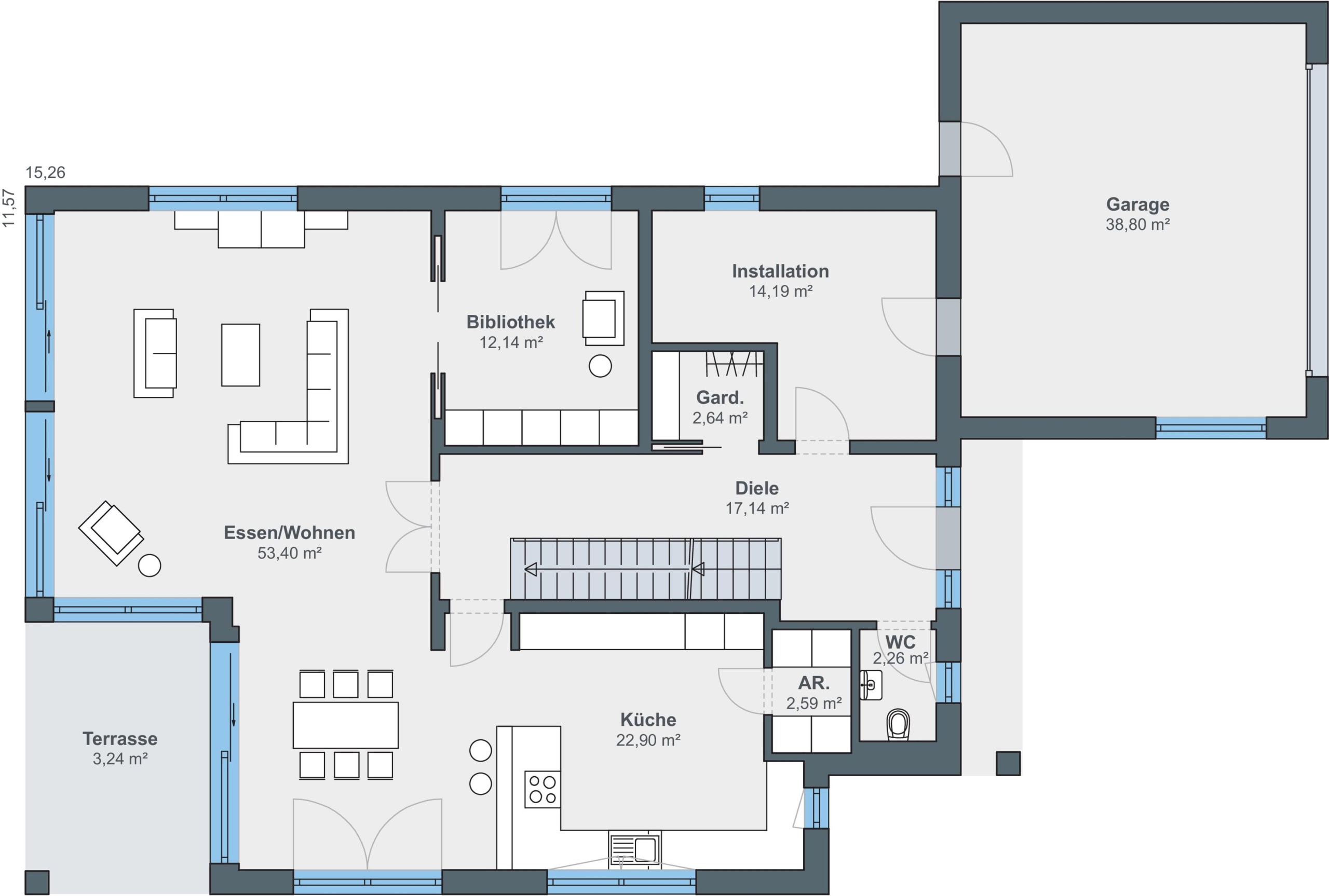 Das Einfamilienhaus bietet insgesamt 4 Zimmer und eine Wohnfläche von rund 241 Quadratmetern. Die Räume verteilen sich auf zwei Etagen. Der Grundriss ist offen und großzügig gestaltet. Im Erdgeschoss befindet sich ein großer Wohn- und Essbereich mit viel Tageslicht. Große Fenster sorgen dafür, dass die Räume hell und freundlich wirken. Von hier aus hat man einen schönen Blick auf die Terrasse und in den Garten. Sehr praktisch ist auch die direkt mit dem Einfamilienhaus verbundene Garage.