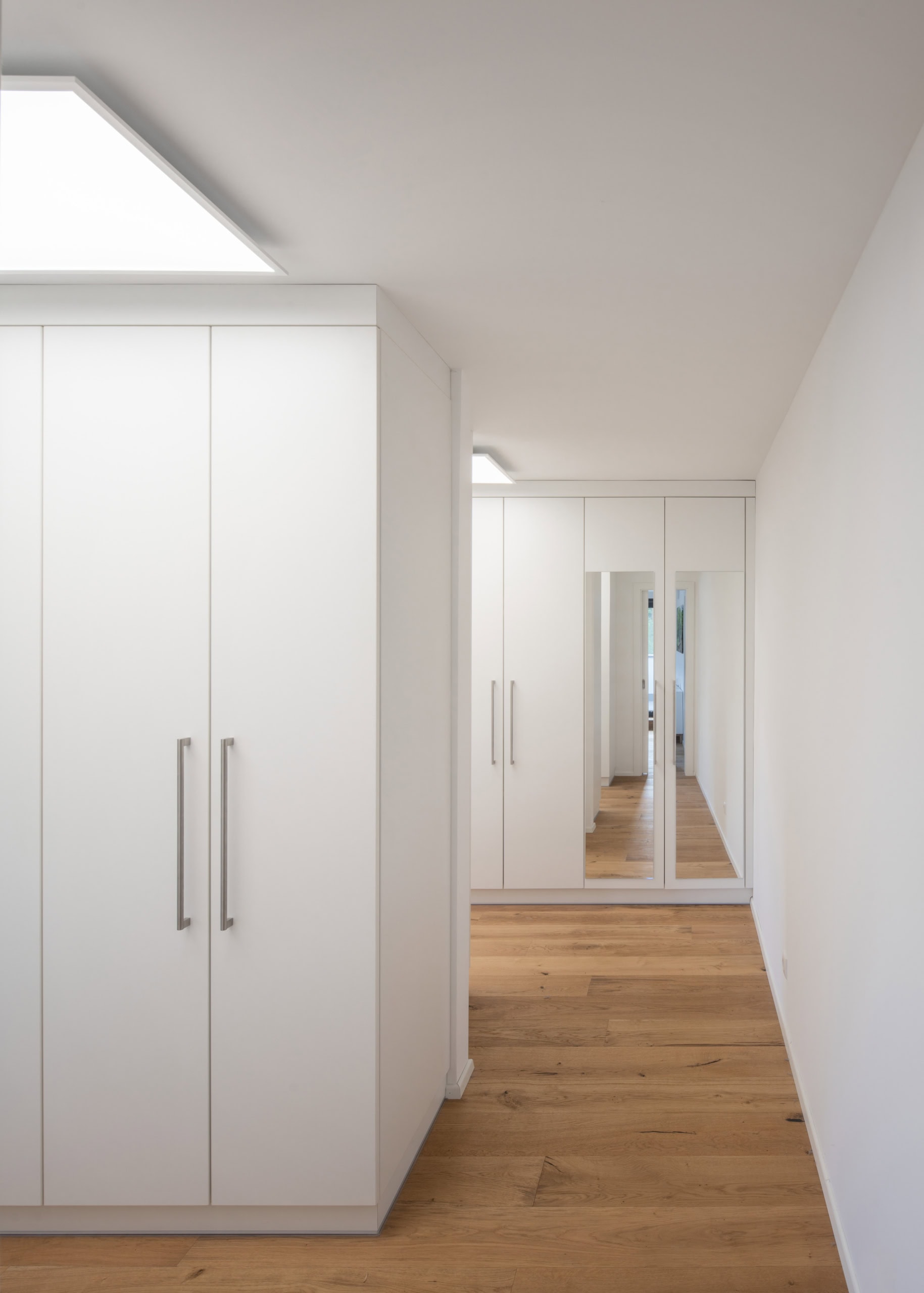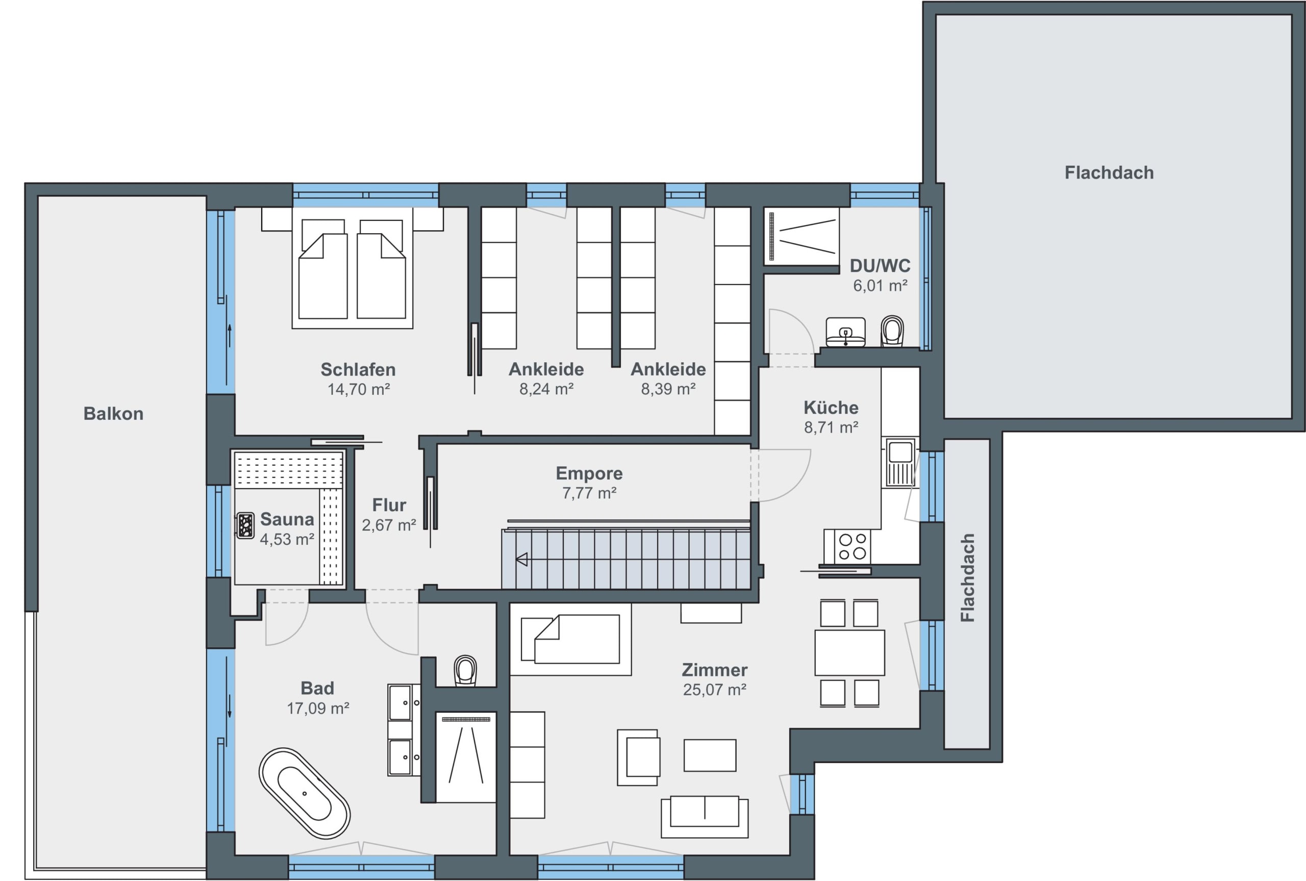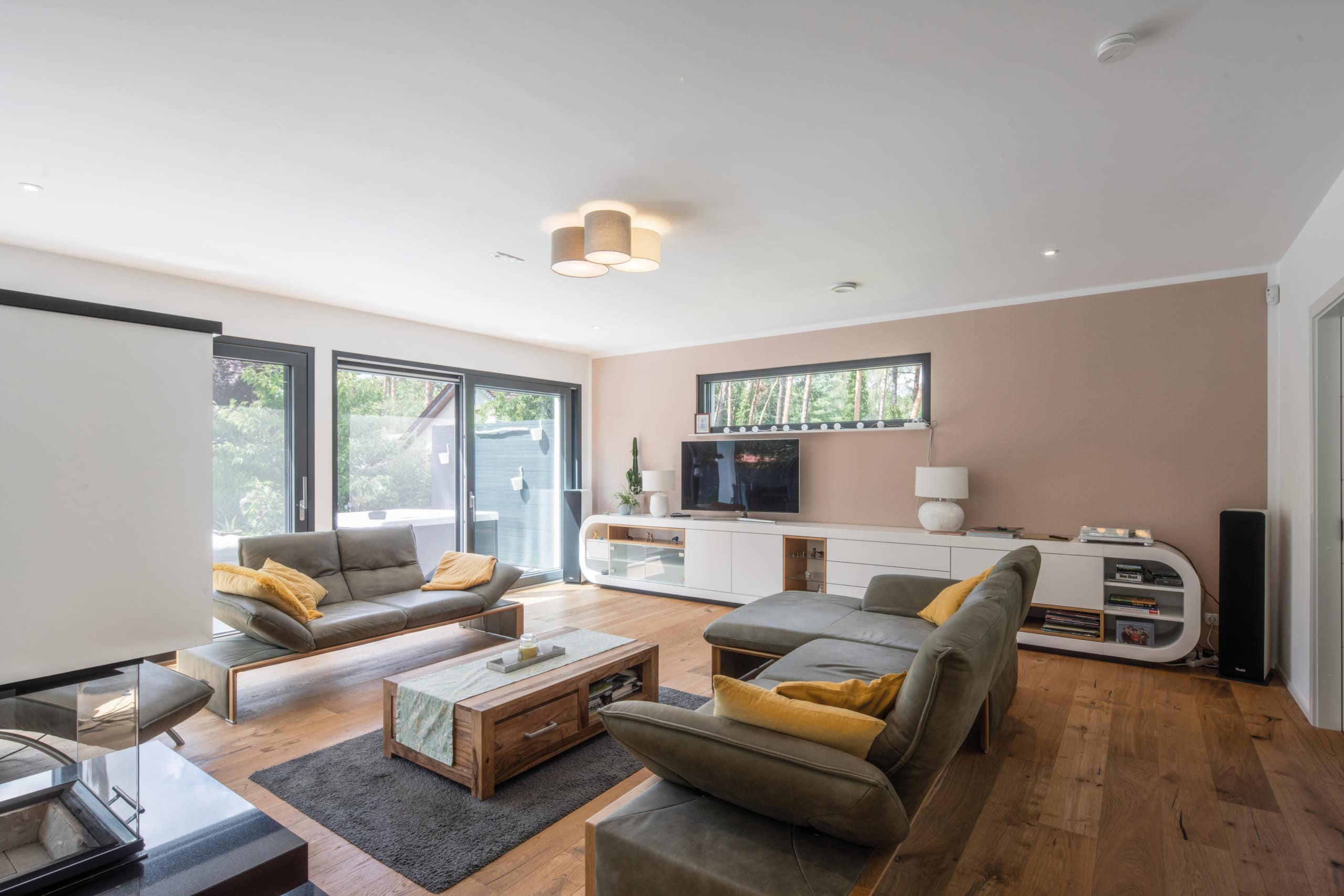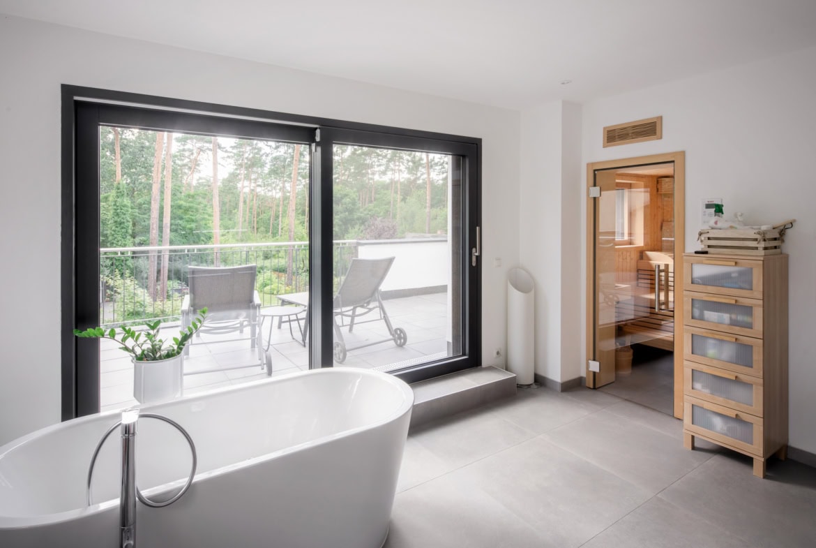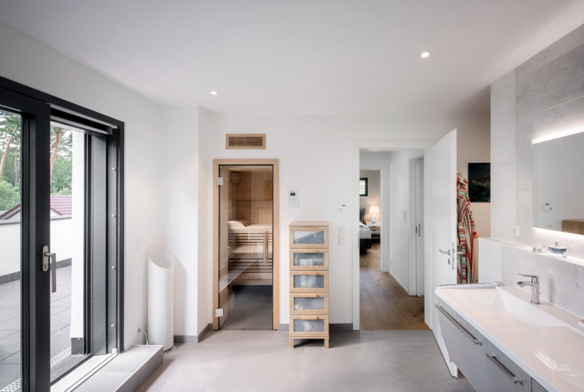 Im Obergeschoss haben sich die Bauherren einen ganz persönlichen Wohlfühlbereich geschaffen. Hier befindet sich ein helles, großzügiges Schlafzimmer mit großer Ankleide und ein modernes Badezimmer mit bodengleicher Dusche, einer freistehenden Badewanne und sogar einer eigenen Sauna.
