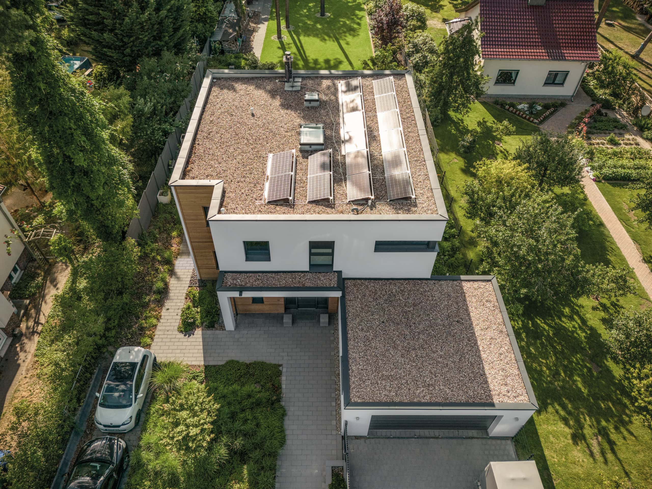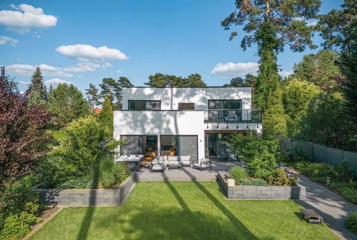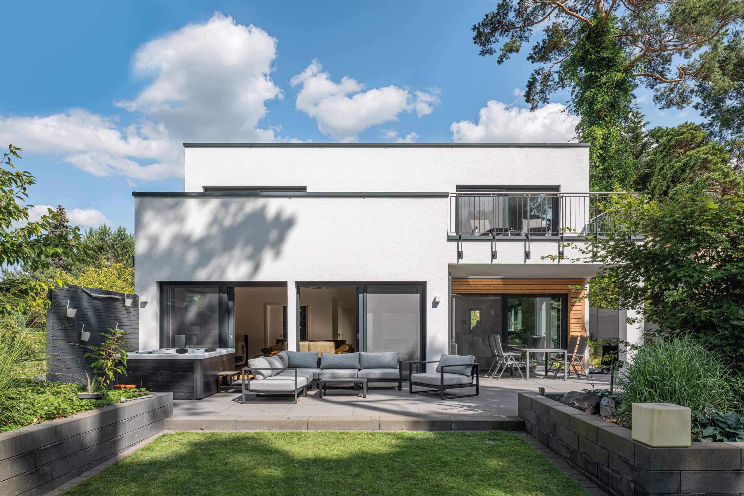Zu den Besonderheiten des Hauses gehört die moderne Fassadengestaltung mit klaren Linien, einer partiellen Holzverschalung sowie große Fensterflächen. Außerdem gibt es eine Terrasse und einen Balkon, die zusätzlichen Wohnraum im Freien bieten. Das Haus verbindet modernes Design mit viel Platz und Komfort und eignet sich besonders gut für Familien, die ein stilvolles und funktionales Zuhause suchen.