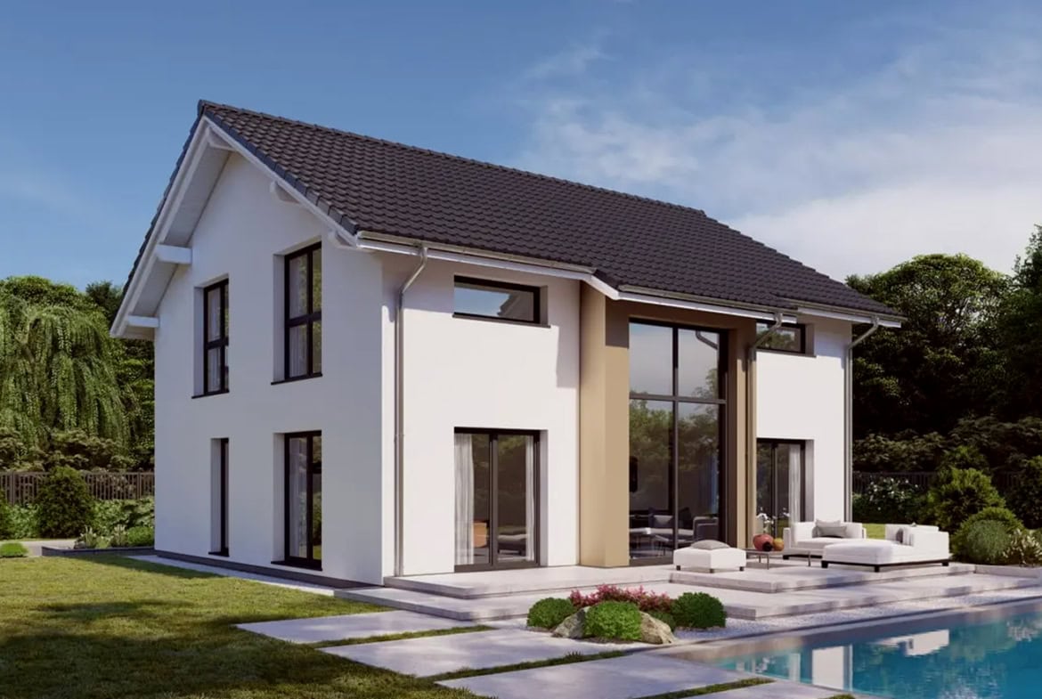 Das Satteldach mit 30° Neigung und ein erhöhter Kniestock von 1,75 m schaffen beeindruckende Höhe, Weite und Freiheit. Jeder Schritt durch dieses Haus fühlt sich an wie ein Atemzug frischer Zukunft.