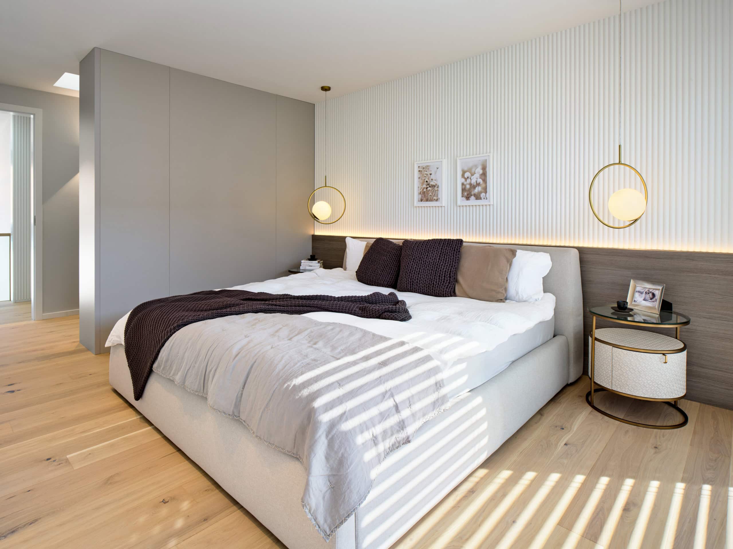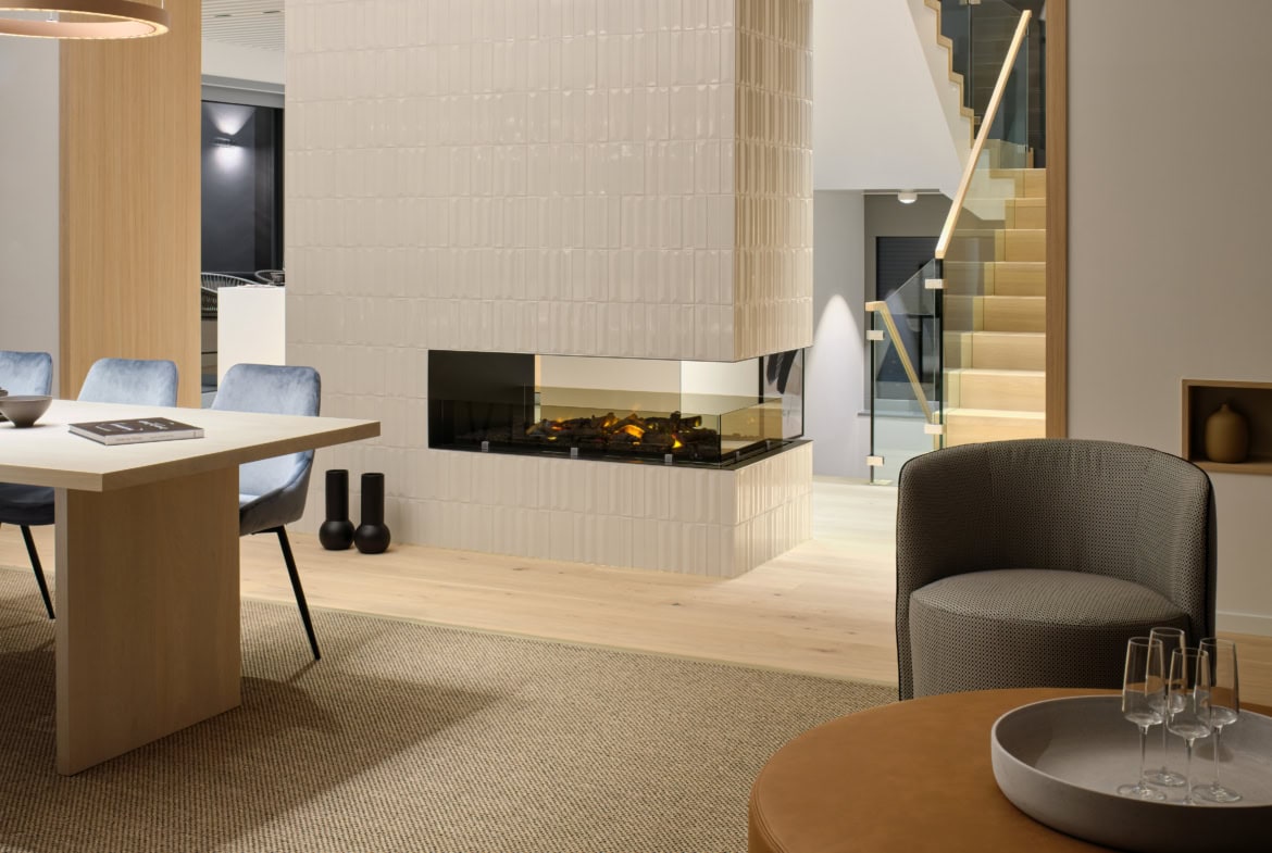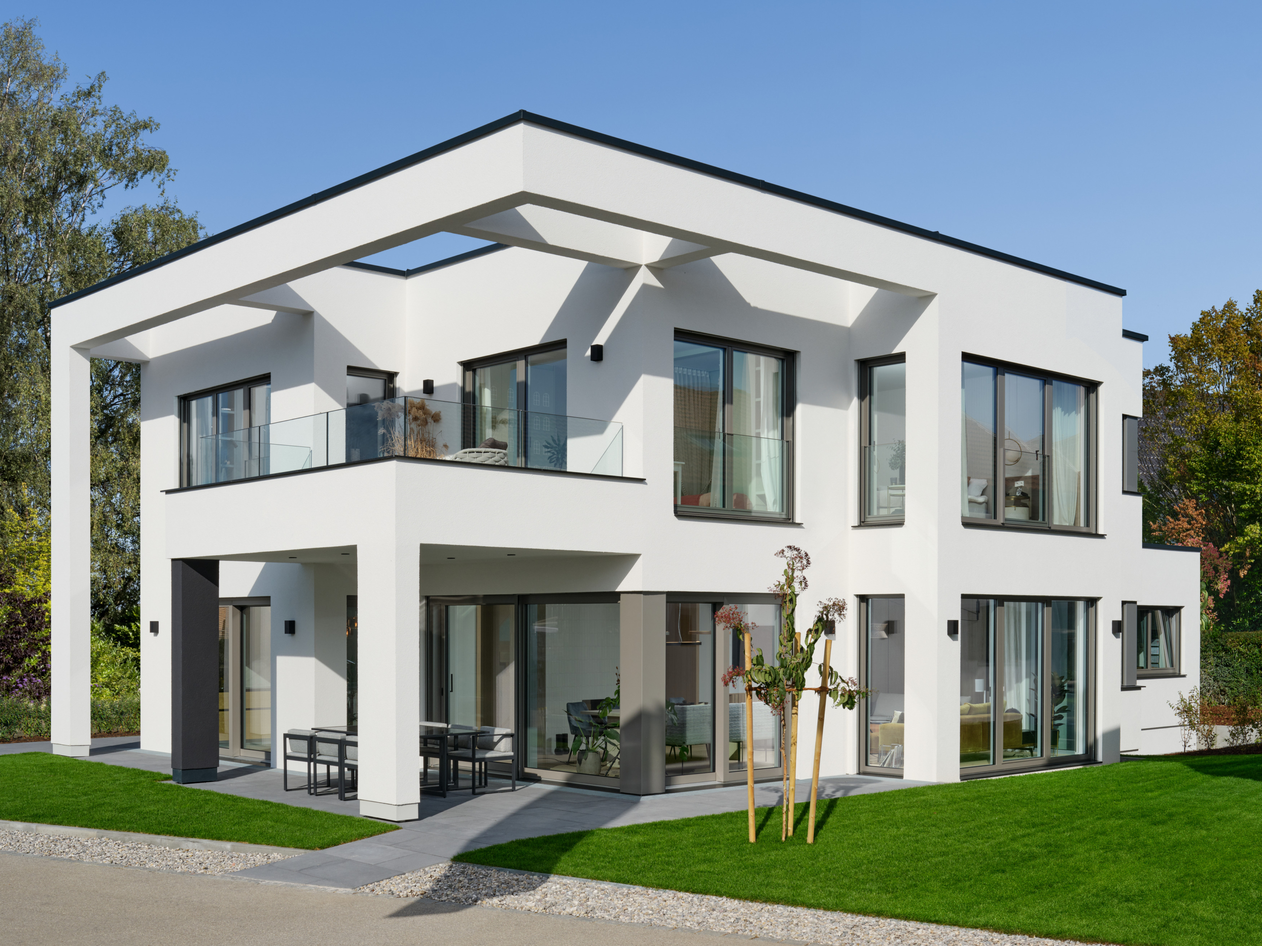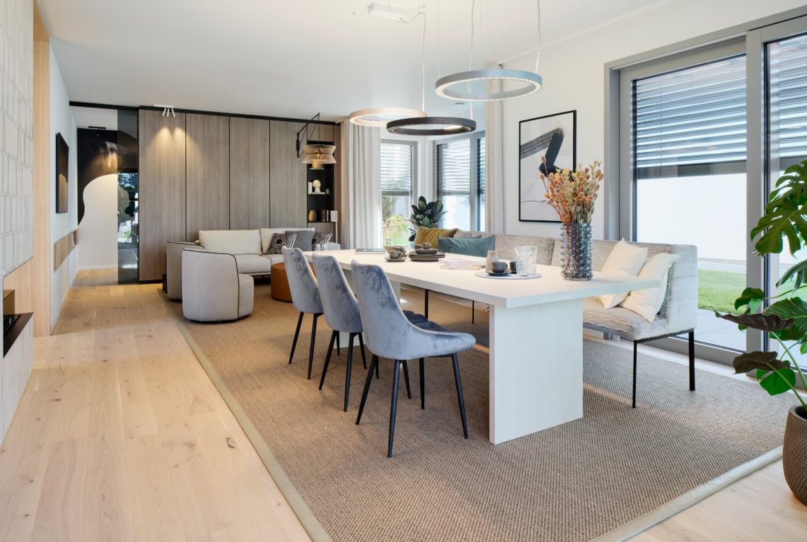 Die von Architekt Hamid von Berg-Hadjoudj entworfene und vom Innenarchitekturbüro Villa Projects weiterentwickelte WeberHaus Villa tritt als klarer, weißer Kubus auf, dessen Dynamik durch markante Auskragungen unterstrichen wird. Großzügige Glasflächen sorgen für fließende Übergänge zwischen Innen- und Außenräumen. Balkone und Terrassen schaffen private Rückzugsorte im Freien, während die direkt angefügte Doppelgarage zusätzlichen Komfort bietet. Auf über 200 Quadratmetern Wohnfläche bietet die moderne Bauhaus Villa mit Flachdach reichlich Platz, um die offene Architektur zu genießen. Mit diesem frei geplanten Architektenhaus beweist WeberHaus erneut, dass modernes Design, Premium-Qualität und eine nachhaltige Holzbauweise perfekt harmonieren. Das Ausstellungshaus im Bauforum München/Poing verbindet zeitgenössische Architektur mit ökologisch nachhaltigen Baustoffen, allen voran dem vielseitigen Material Holz.