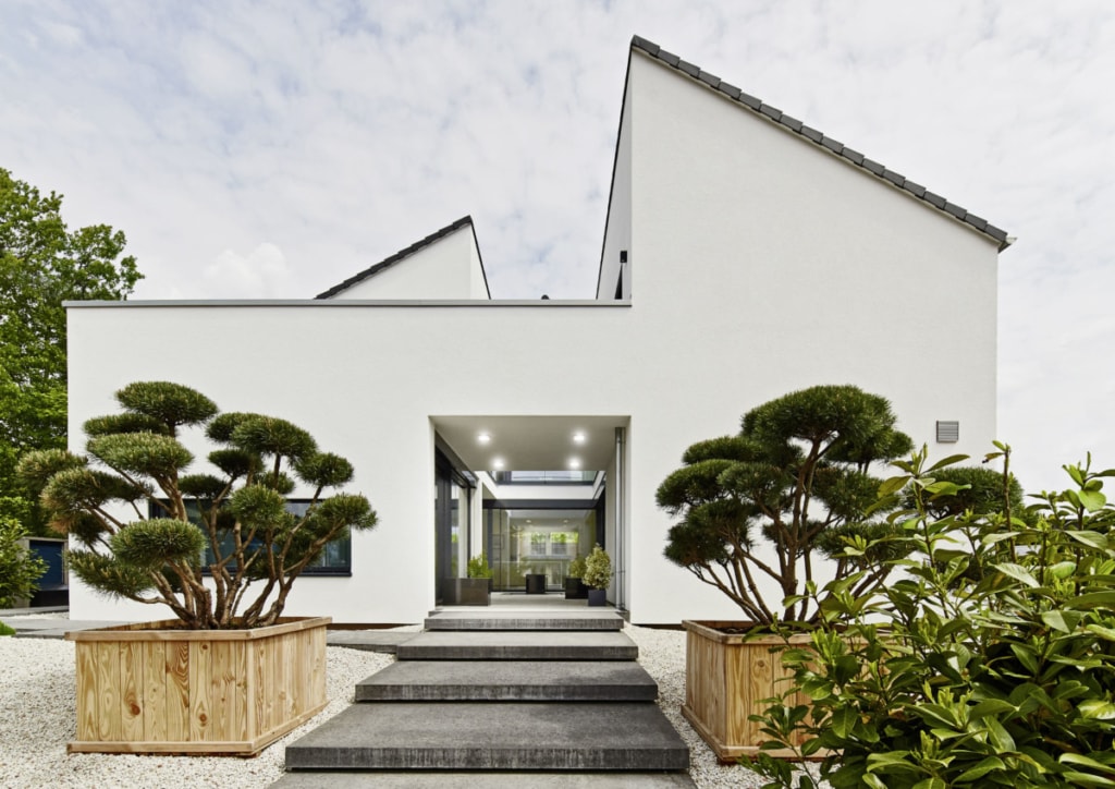 Das Einfamilienhaus Passivhaus 153 P zeigt sich in einer modernen Architektur mit Pultdach. Die Außenfassade vom Stadthaus überzeugt im Obergeschoss mit einer Holzverkleidung und im Erdgeschoss mit einer weißen Putzfassade. Die bodentiefen Fenster lassen viel Licht in die untere Etage vom Fertighaus mit Pultdach. Im Inneren vom Einfamilienhaus ist das Erdgeschoss offen und großzügig gestaltet. Der Wohn- und Essbereich mit offener Küche nimmt fast die gesamte Fläche von der unteren Etage ein. So ist auch für Gäste vom Stadthaus ausreichend Platz. Im Dachgeschoss vom Passivhaus 153 P planen die Hartl Haus Architekten die Rückzugsorte der Familienmitglieder. Dazu zählen zwei Kinderzimmer und ein Elternschlafzimmer. Zudem steht den Bewohnern in der oberen Etage vom Fertighaus ein Bad und ein separates Gäste-WC zur Verfügung.