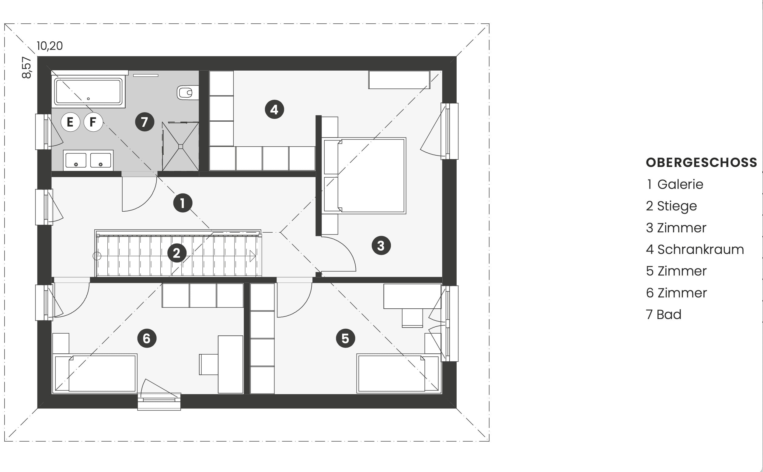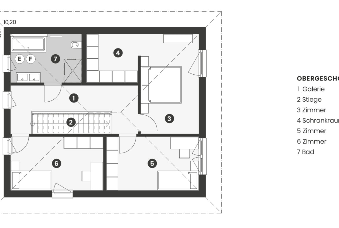 Über eine gerade Treppe gelangt man in das Obergeschoss. Hier bietet die moderne Fertighaus Stadtvilla ELK Now 143 viel Platz für zwei helle Kinderzimmer, ein großzügiges Schlafzimmer mit Ankleide sowie ein modernes Bad als ruhige Rückzugszone für Erholung und Privatsphäre.