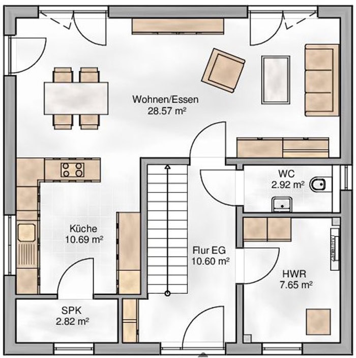 Dieses Haus ist ausgestattet mit einer Fußbodenheizung, Luft-Wasser-Wärmepumpe und v.m. Außerdem wählen Sie die Fenster- und Haustürfarbe, sowie die sanitäre Standardeinrichtung verschiedener Markenfirmen. Unser Preis versteht sich inklusive Bodenplatte und Erdarbeiten.