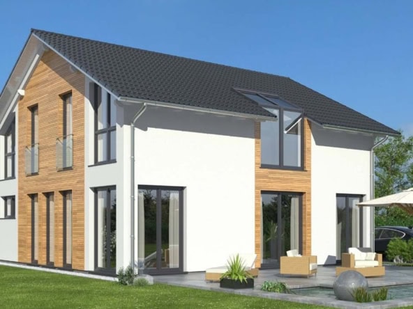 Entspannt an den Töpfen stehen und zugleich Zeit für Familie und Gäste haben – durch die zum Essbereich gewendete Kochlösung ist das kein Widerspruch. Der offen gehaltene Übergang zum Wohnzimmer kann auf Wunsch abgetrennt werden. Auch unter dem Dach ist viel Platz. Darunter passen bequem ein großes Bad mit Wanne und Dusche, ein Elternschlafzimmer mit begehbarem Kleiderschrank und zwei Kinderzimmer.